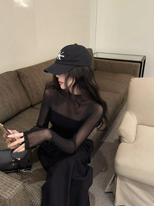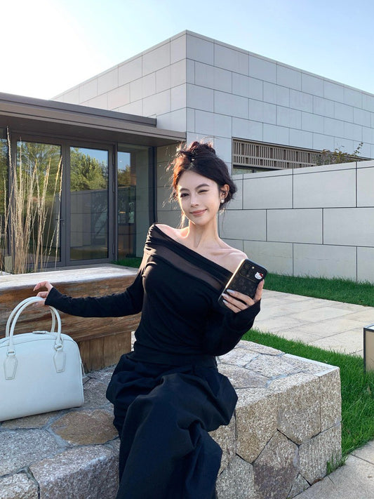 NA+ 冬日嗲系純慾2.0網紗拼接一字領上衣 黑