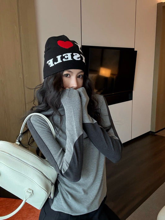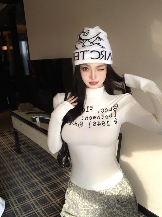 NA+ 港風復古磨毛字母緊身打底上衣 米/咖/黑