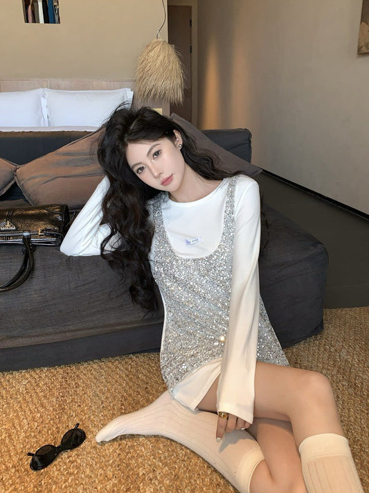 NA+ 大王blingbling 絨絲亮片拼接圓領上衣 白/灰