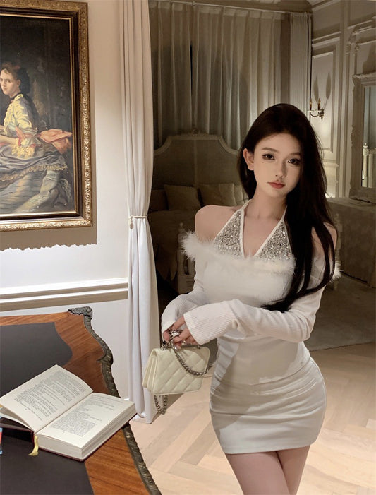 NA+ 甜乖純慾水鑽羽毛針織上衣 白/黑