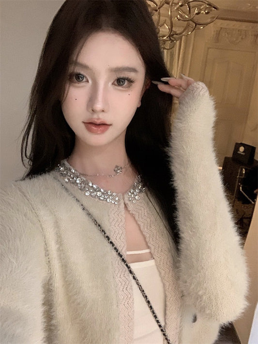 NA+ 氣質軟糯水貂毛鑲鑽小香針織外套