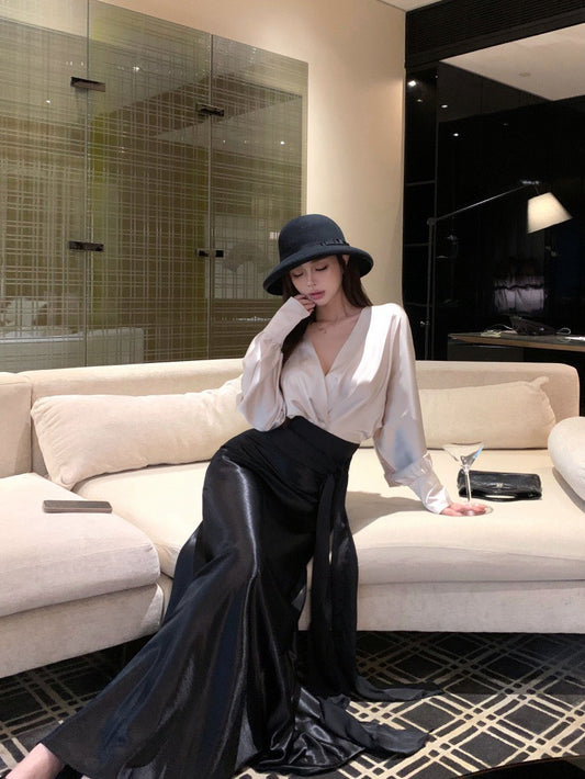 NA+ 貴氣富千金蝙蝠袖V領緞感襯衫 香檳白