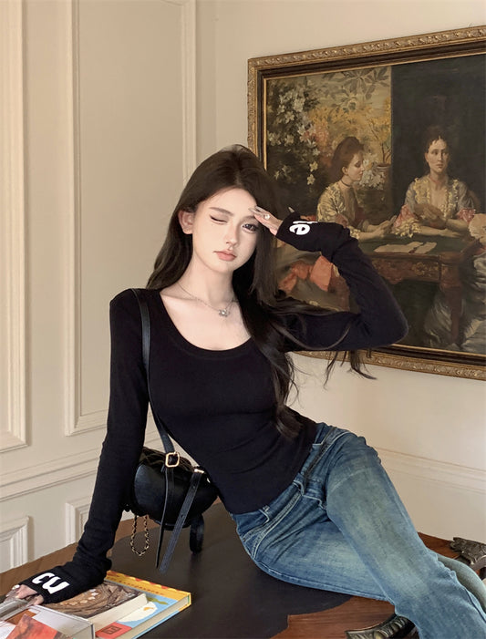 【Na+】軟糯舒服字母袖U領打底上衣 黑/米杏