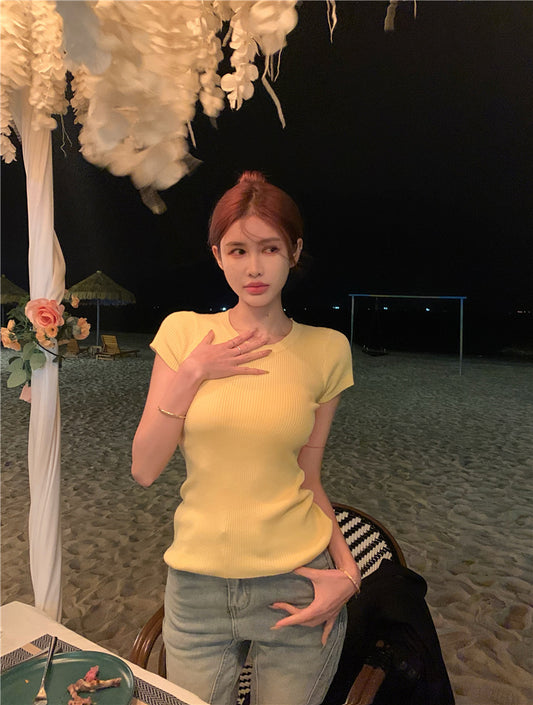 【Na+】百搭圓領螺紋素色正肩上衣 奶黃