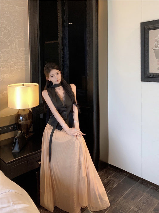 Na+ 鎏金夜宴 氣質蕾絲黑色西裝馬甲 輕奢網紗半身裙