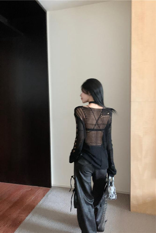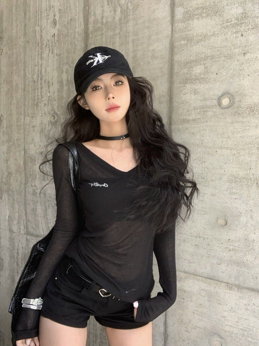 NA+ 火辣單品透視感燙鑽長袖打底 黑