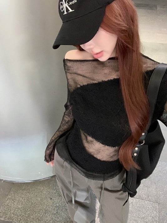 "Na+"立體織花縷空拼接斜肩上衣 黑色