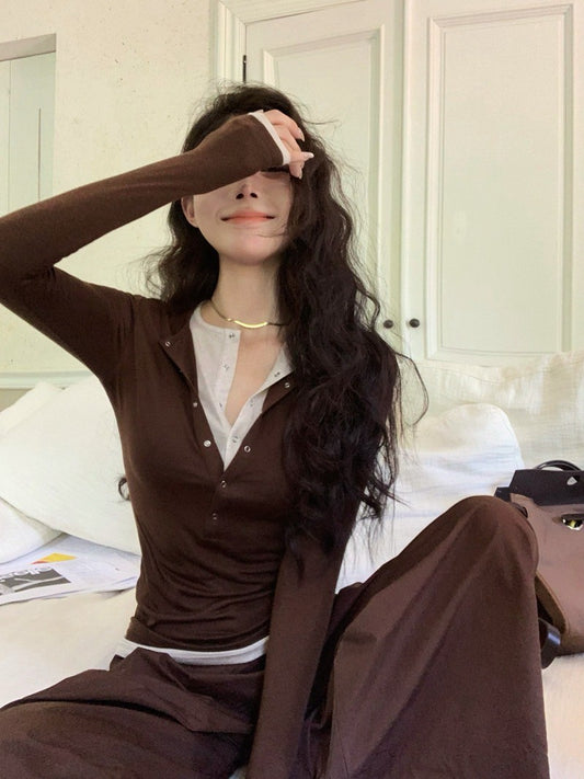 "Na+"韓系假兩件式撞色排扣長袖上衣 灰/咖