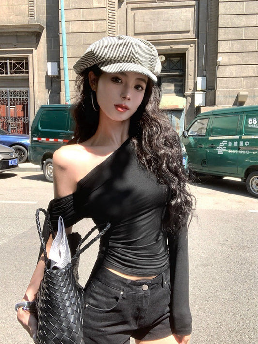 ''Na+''御姐氣質 斜領飄帶顯瘦長袖上衣 黑/白