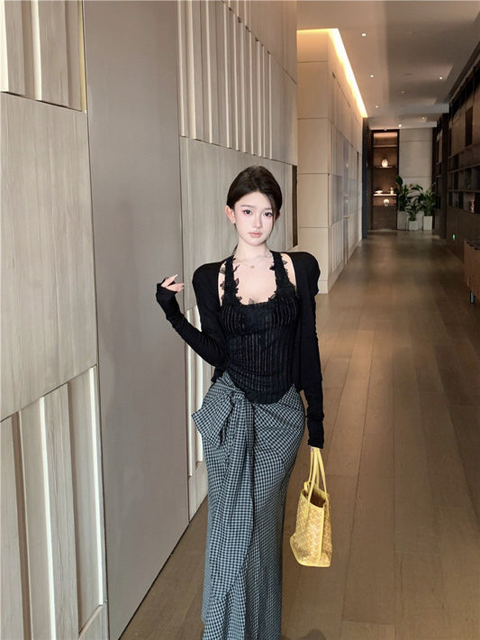 Na+ 復古法式純慾蕾絲背心 設計綁帶格紋半身長裙