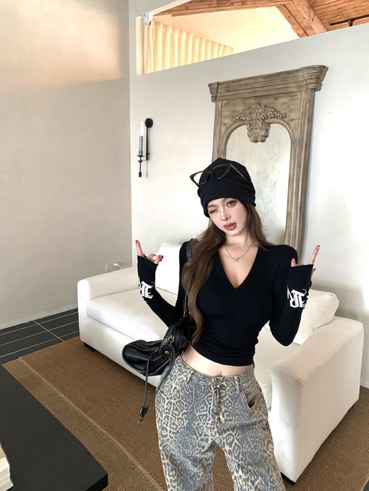 NA+ 性感辣妹手袖字母V領拉鍊打底上衣 黑/咖