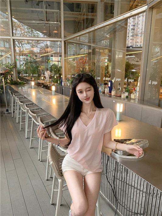 NA+ 熱銷款女王回歸 面膜V領T恤 粉/灰