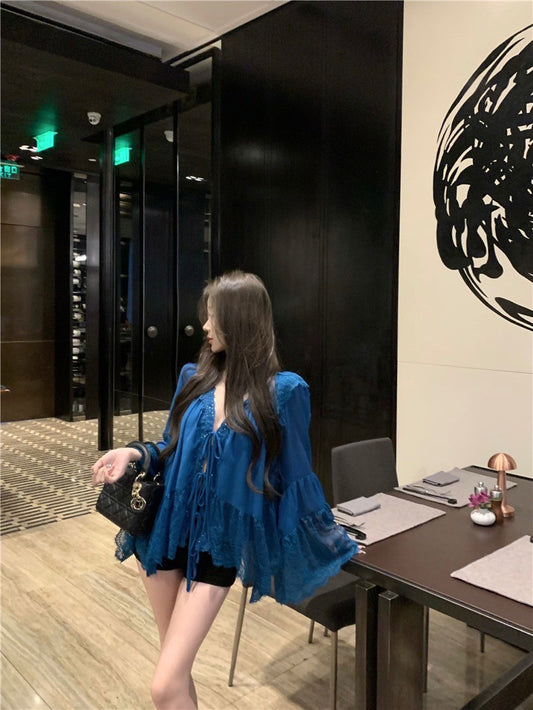 Na+ 氣質名媛重工孔雀藍蕾絲繡襯衫