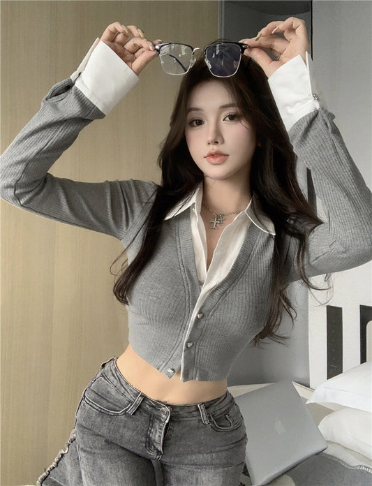Na+ 韓女秘書 假兩件撞色襯衫短款上衣 灰