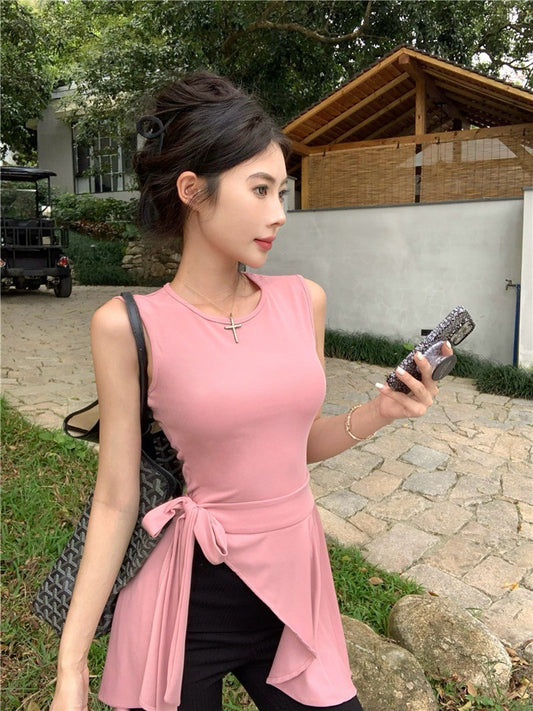 Na+ 氣質名媛簡約圓領純色收腰無袖上衣 粉/黃/黑