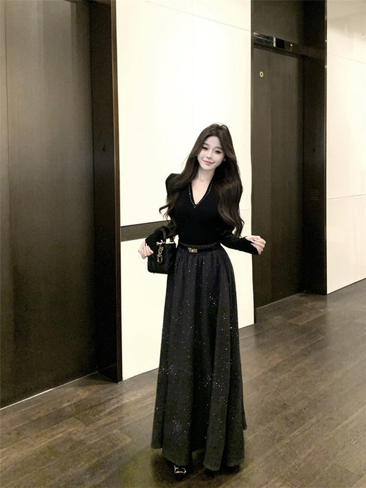 NA+ 輕奢復古修身上衣 燙鑽大裙擺半身裙 黑