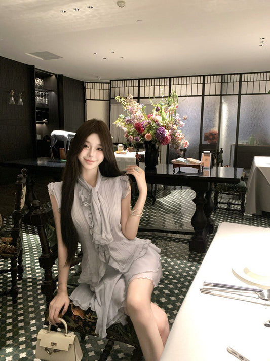 NA+ 南洋千金雪紡飄逸荷葉上衣 不規則半身裙 藍灰
