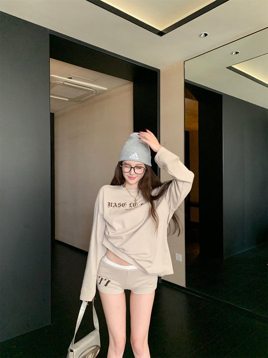 NA+ 居家Find out寬鬆字母上衣 拼接緊身短褲 奶茶色