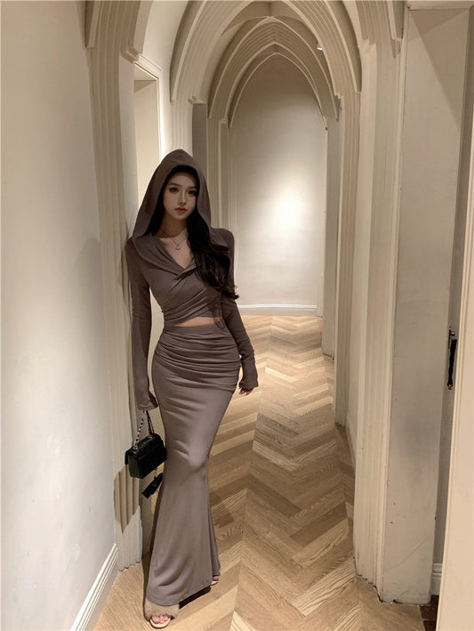 NA+ 「窈窕」復古回歸連帽交錯上衣/魚尾半身裙 沙丘色
