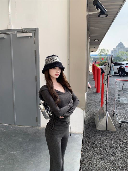 NA+ 基礎好身材修身連帽v領薄長上衣 微喇叭休閒褲 深灰