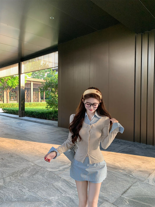 NA+ 氣質學院假兩件式條紋針織襯衫 條紋半身褲裙