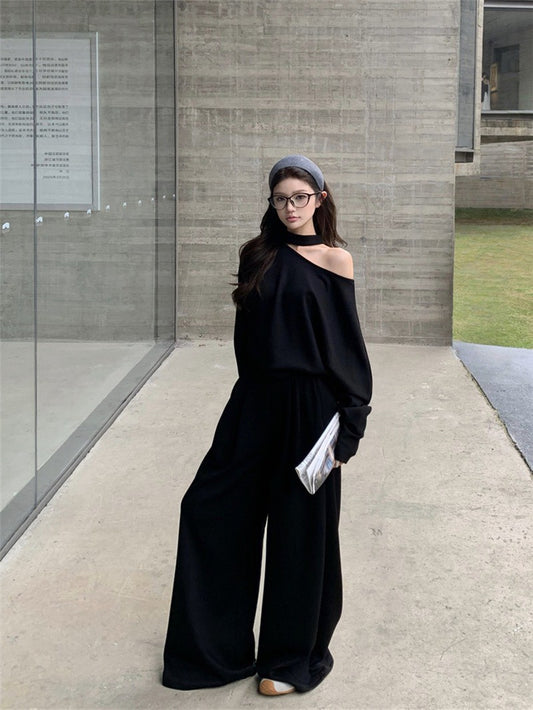 NA+ 美式鬆弛 不規則露肩衛衣 休閒褲 黑