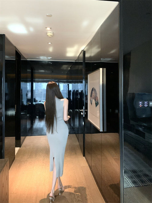 NA+ 溫柔歐膩低飽和藍灰針織背心 開叉半身裙