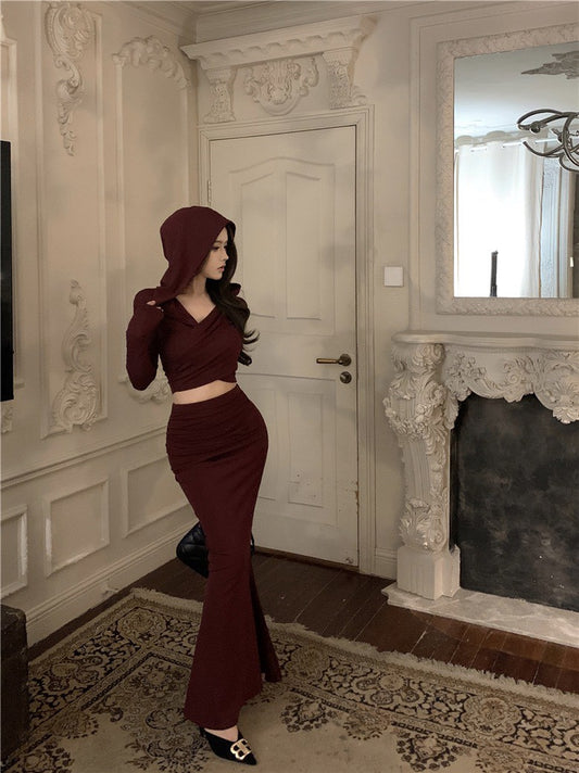 NA+ 「窈窕」復古回歸連帽交錯上衣/魚尾半身裙 波爾多紅/黑