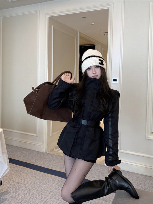 ''Na+''冪式私服 時髦收腰加絨衝鋒外套 黑