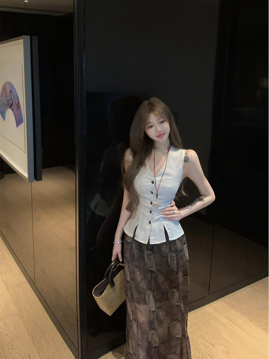 NA+ 復古V領收腰排扣馬甲 印花雪紡裙