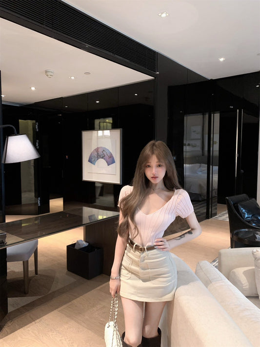 NA+ 純慾歐尼v領坑條針織上衣2色 高腰包臀裙