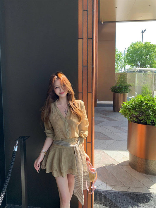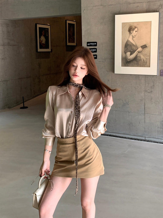 NA+ 氣質光感緞面香檳金襯衫 卡其色半身裙(2款選)