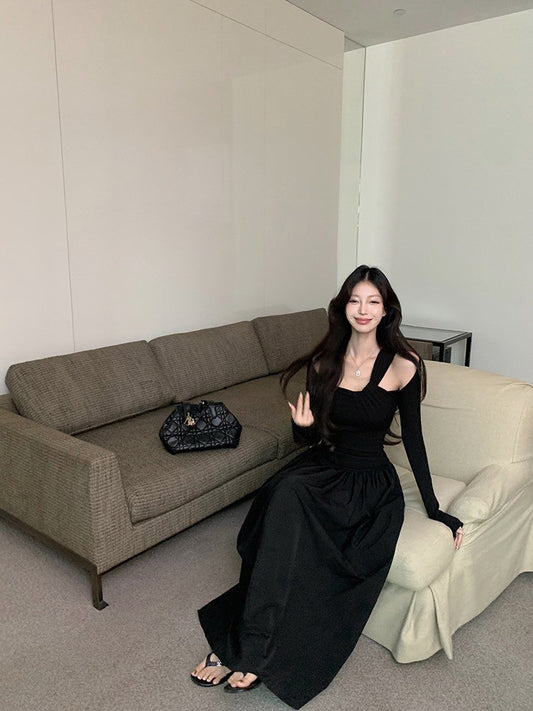 ''Na+''夢醒時分 斜領扭結針織拼接連身裙 黑