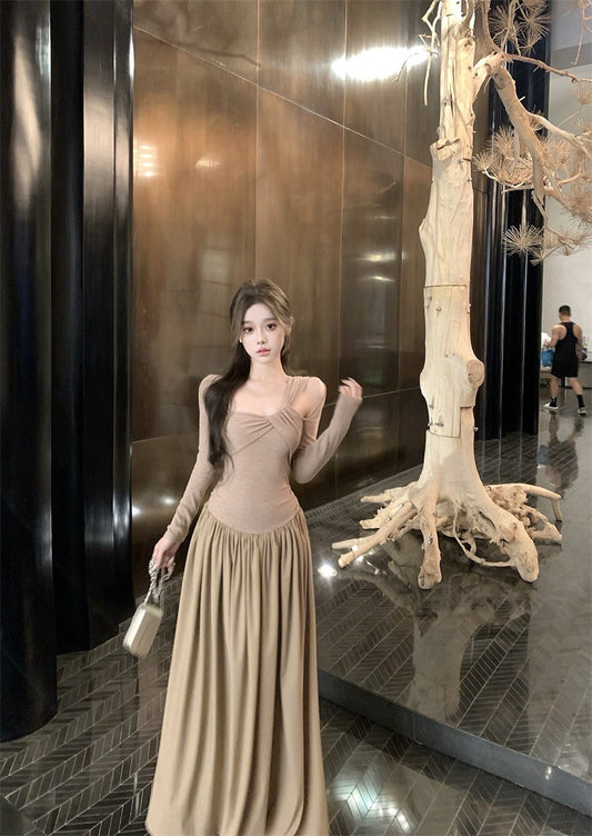 ''Na+''氣質晚宴 一字領小細腰開叉連身裙 棕