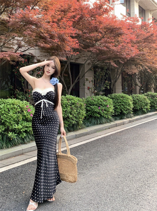 Na+ 溫柔甜心 波點撞色蝴蝶結抹胸連身裙