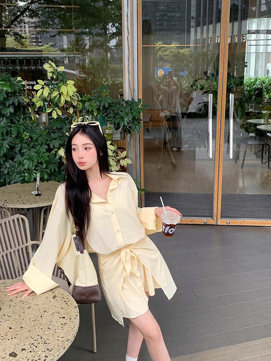 ''Na+''韓系糖果衫 法式綁帶收腰襯衫裙 鵝黃