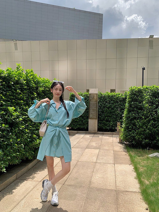 ''Na+''韓系糖果衫 法式綁帶收腰襯衫裙 薄荷藍