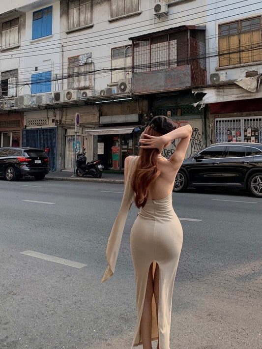 ''Na+''御姐性感 重工設計感水滴鑽收腰連身裙 卡其