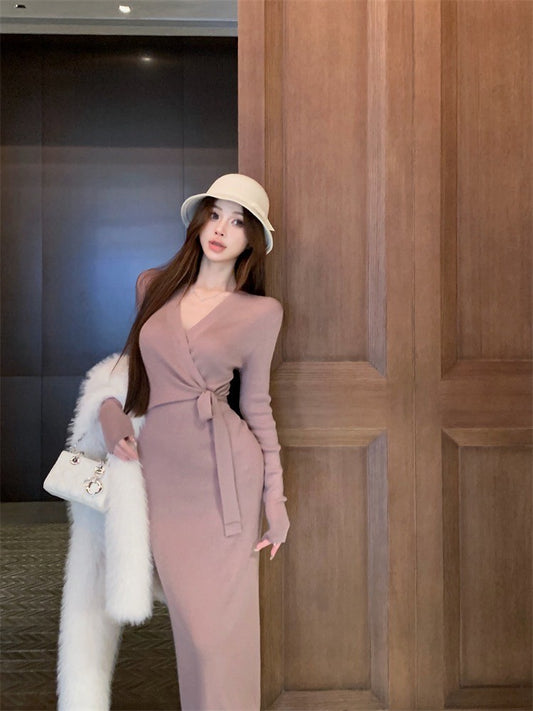''Na+''溫柔女主人 V領修身交錯綁帶針織連衣裙 墨粉