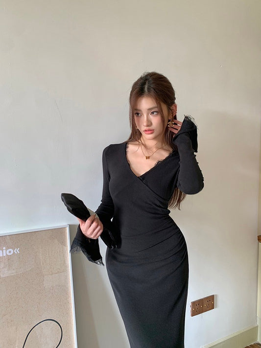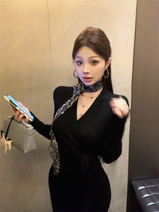 ''Na+''溫柔女主人 V領修身交錯綁帶針織連衣裙 黑