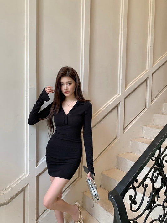 ''Na+''生活美學通勤百搭polo領不修邊V領包臀裙 黑