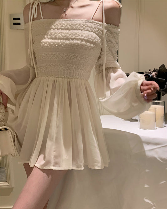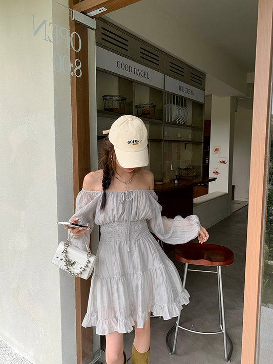 【Na+】法式甜心 泡泡袖一字領雪紡連身裙