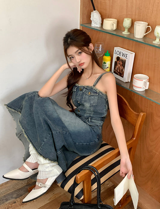 【Na+】流蘇鬚邊 復古馬甲式牛仔連身長裙