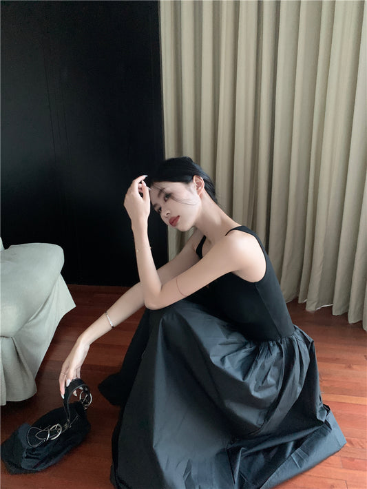 【Na+】氣質百搭大U領拼接連身裙 黑