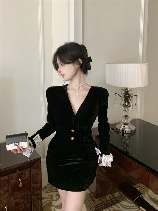 【Na+】大女主 絲絨蕾絲繞邊連身裙