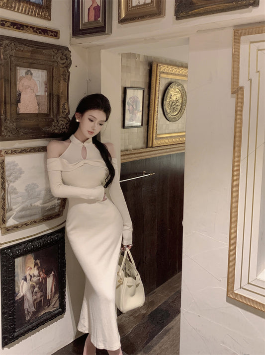【Na+】新中式類旗袍8字美肩連身裙 米白