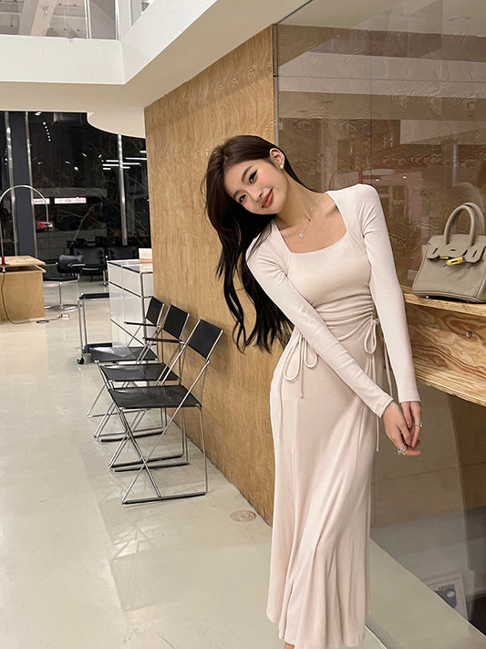 【Na+】氣質方領腰際顯瘦束繩抓皺連身裙 杏