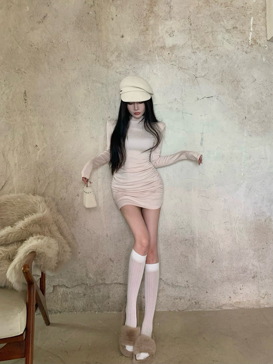 【Na+】莫代爾高彈力磨毛高領連身包臀裙 杏/咖