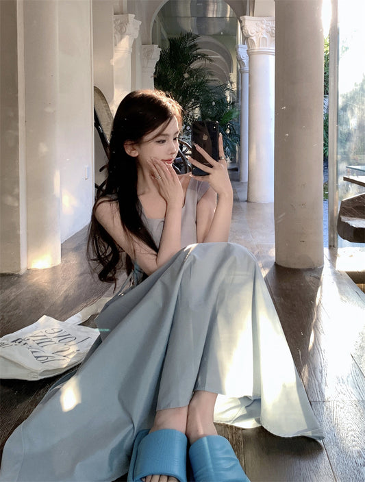 【Na+】氣質方領 抽繩收腰顯瘦連身裙 淺藍