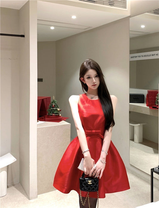''Na+''80復古 經典圓領背心收腰蓬蓬連身裙 紅/黑